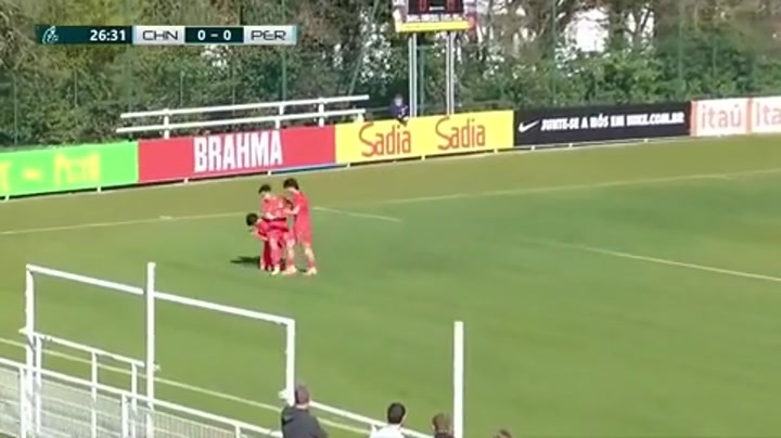 蒙太古杯U16国足对阵秘鲁U16 刘凯源左脚低射破门