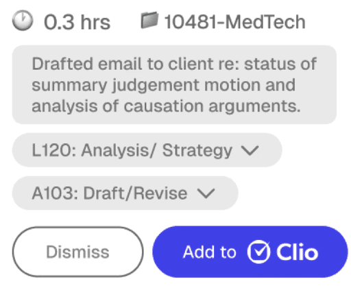Ajax writes client-ready narratives, picks matters and activity codes, and surfaces polished entries to you as you work.