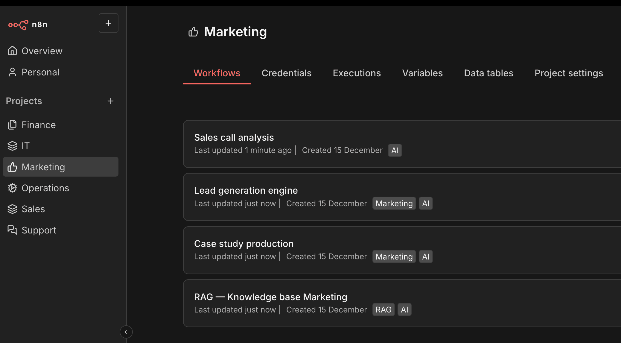 Organize workflows, credentials, and your data into isolated projects to support multiple teams or use cases on the same instance. Projects help you avoid cross-access to data and manage automation at scale with clearer ownership and boundaries.
