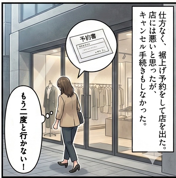「パンツは買わずに帰りました。その後二度とその店には行っていません」と書いていた女性。裾上げしてもらって買わないのは本来は許される行為ではないが、それだけイライラした、ということなのだろう。※このマンガの制作にはAI(Gemini)を使用しています。