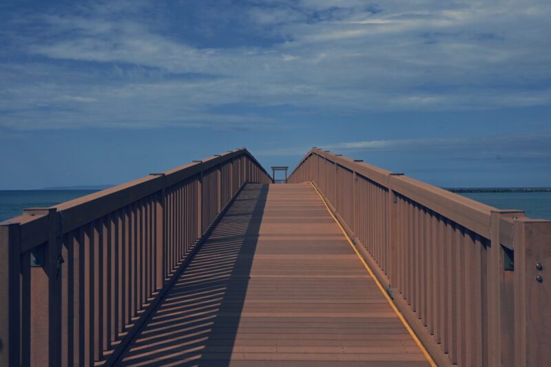 天領の里の敷地内には、全長102mの桟橋「夕凪の橋」が日本海に向かってまっすぐ架かっています。