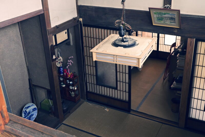 木造建築の吹き抜けで、「家」と「蔵」が一体化したような造りになっています。私は日本家屋について詳しくありませんが、あまり見かけない構造なのではないでしょうか。