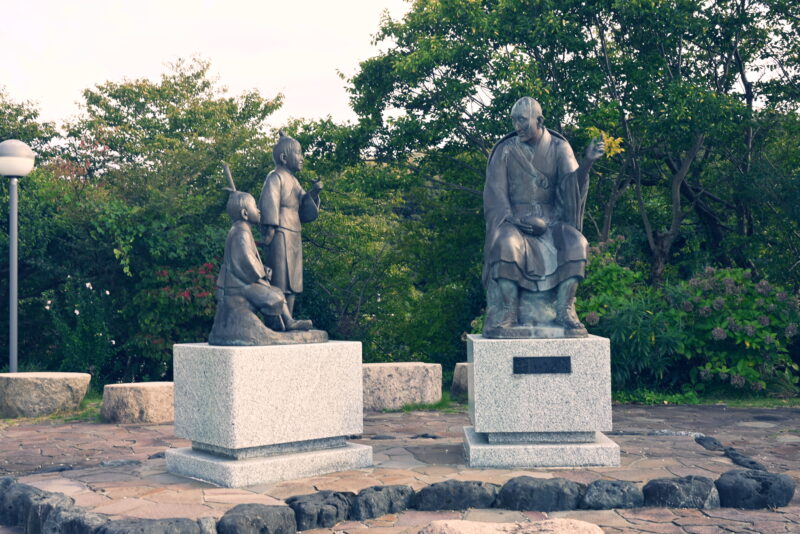 童たちと談笑される良寛さんの像があり、眼下には良寛さんの愛した出雲崎の街並みと、日本海が一望できる抜群のロケーションが広がっています。