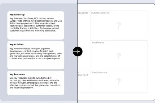 Diga adeus ao “problema da página em branco”! Converse com o bot de IA para moldar rapidamente sua ideia de negócio, refinar seu argumento de venda e acelerar sua jornada de startup — veja como funciona, aprenda por que o ChatGPT sozinho não pode fazer o mesmo, e descubra o que você ganha.