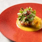 素材の旨味の極致を見出す熟成、発酵を用いたメニュー創りを得意とするシェフ 井澤は、若き挑戦者。 彼が選んだ調理方法で素材がどんな魅力的なひと皿として仕上がってくるのかも楽しみの一つ。 驚きと発見のある、型にとらわれないボーダレスな一品をご堪能ください。