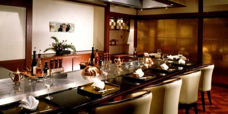 入り口を入り、ゴージャスなラウンジコーナーを抜けると目の前に鉄板焼きカウンターが構えております。ランチタイムには自然の光を入り込む明るい雰囲気の店内は、10席並んでいるオープンカウンターと、2部屋の個室からなる全20席の鉄板焼きカウンターは、落ち着いた雰囲気でお食事をお楽しみいただけます。2部屋の個室は、パテーションを空けることで最大10名様までご利用いただけます。店内には、新鮮な野菜のディスプレイなどもあり、お食事への期待感を高めて参ります。