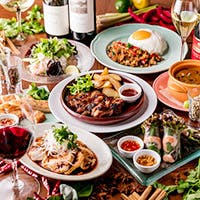 【飲み放題メニュー】 ●ビール 生ビール シャンディーガフ ●ウィスキー ハイボール ジンジャーハイボール ●焼酎 レモンサワー 黒烏竜茶ハイ ジャスミンハイ ●カシス カシスオレンジ カシスウーロン カシスジャスミン カシストロピカルティー ●ワイン 赤ワイン 白ワイン スパークリングワイン ●サングリア 赤サングリア 白サングリア ●スピリッツ ジントニック モスコミュール ラムコーク ●ソフトドリンク コーラ ジンジャエール オレンジジュース グレープフルーツジュース ウーロン茶 ジャスミン茶 【人気メニュー選りすぐり】 ガパオライスやハーブ豚のグリルなど、人気の定番料理を盛り込んだ、お得感満載の飲み放題付きコースです。多彩なスパイスを使った味わいはもちろん、器や盛りつけにもこだわり見た目も華やか。女子会や合コンなど、さまざまなシーンでご利用いただけます。アニバーサリープレートもご用意できるので、サプライズやお祝いにもぜひ。 ディナー 4,500円