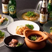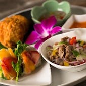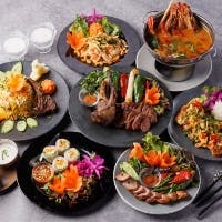 香り豊かなタイ料理を多彩に楽しめる、2時間飲み放題付き全12品の充実したコースです。 生春巻きや海老トースト、魚のすり身揚げなど、タイの定番前菜をバランスよく揃え、発酵ソーセージや青パパイヤのサラダ、春雨のスパイシーサラダと続きます。魚料理には、白身魚をレモンと香味野菜でさっぱりと仕上げた蒸し料理、香り高いレモングラスを効かせた海老の唐揚げをご用意。メインには、香草とタマリンドソースで味わう牛肉のグリル、野菜たっぷりの牛肉オイスターソース炒めを揃え、食べ応えも十分です。締めはガパオライスまたはパッタイから選べる食事と、マンゴーともち米の定番デザートをお楽しみいただけます。生ビールやハイボール、各種サワーを含む飲み放題とともに、宴会やグループでの集まりにおすすめのプランです。 ディナー 7,000円6,000円(14%OFF)