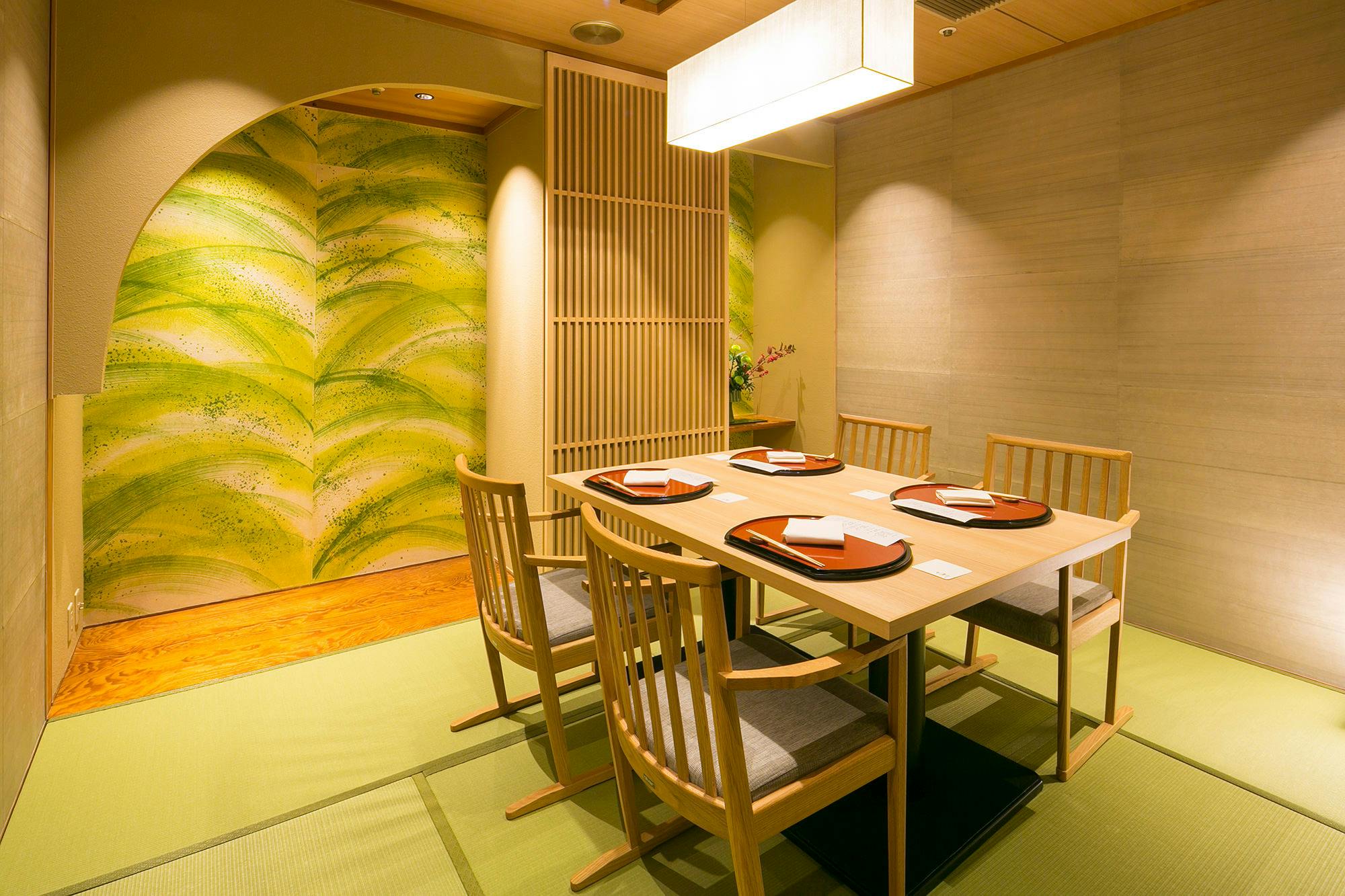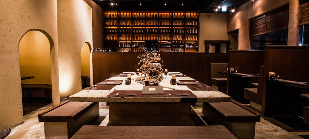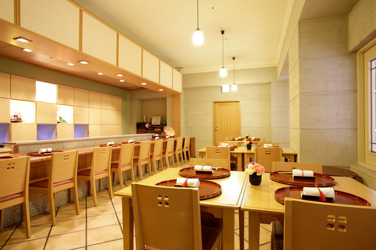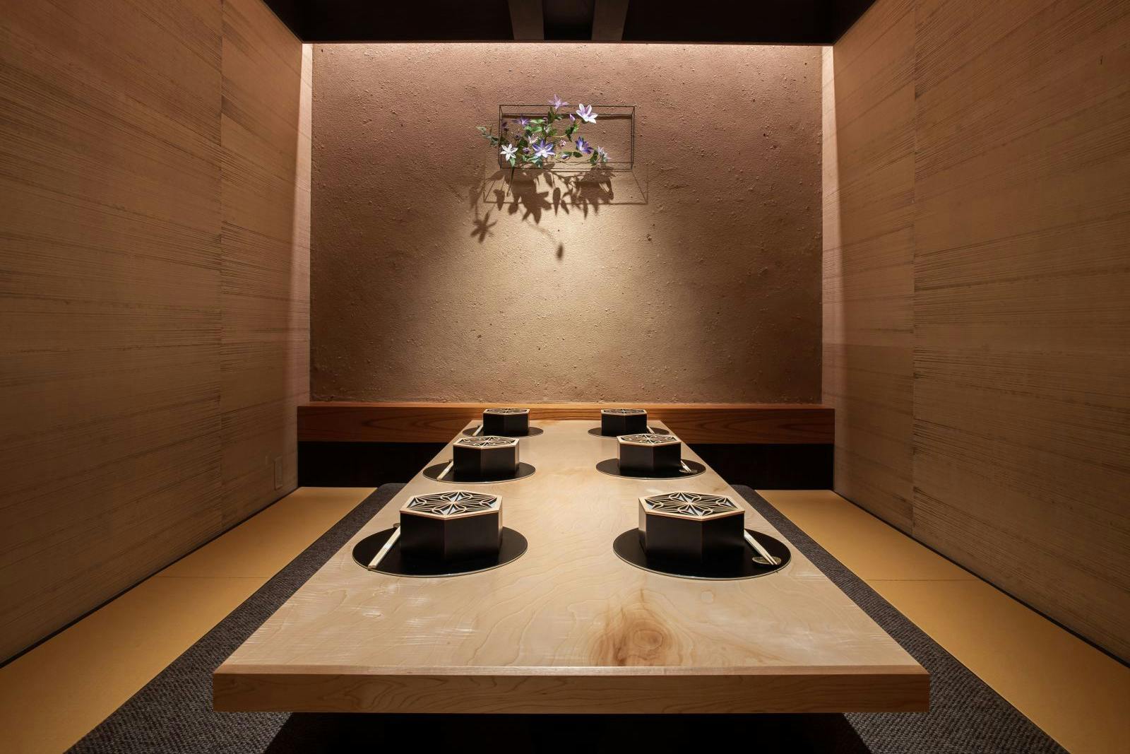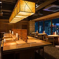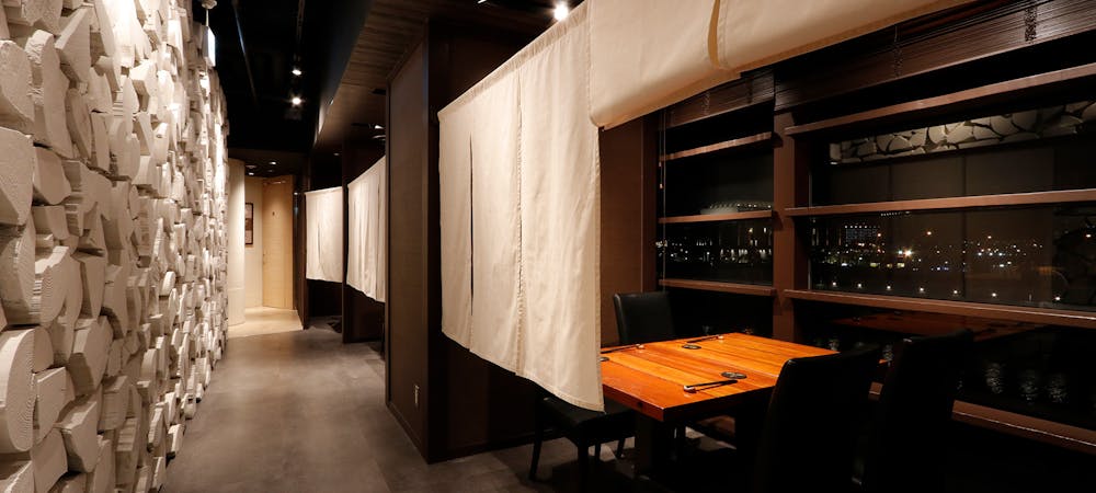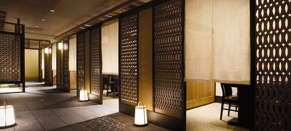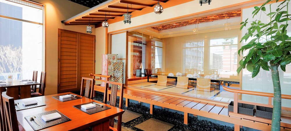 のれんをくぐり階段を下りると広がる、木材や石材など自然の素材と現代的なしつらえを融合させた落ち着いた空間。書道家が心を込めて描いた書のアートワークや盆栽のオブジェ、坪や暖簾などをあしらい、独特の世界観をお楽しみいただけます。半個室もご用意し、ダイニング内のカウンターには日本全国のお酒を味わえる角内も。ホテルダイニングならではのクラス感あるおもてなしで、外の喧騒を忘れるひと時をご提供いたします。