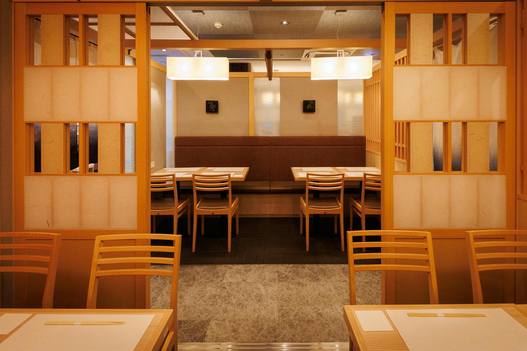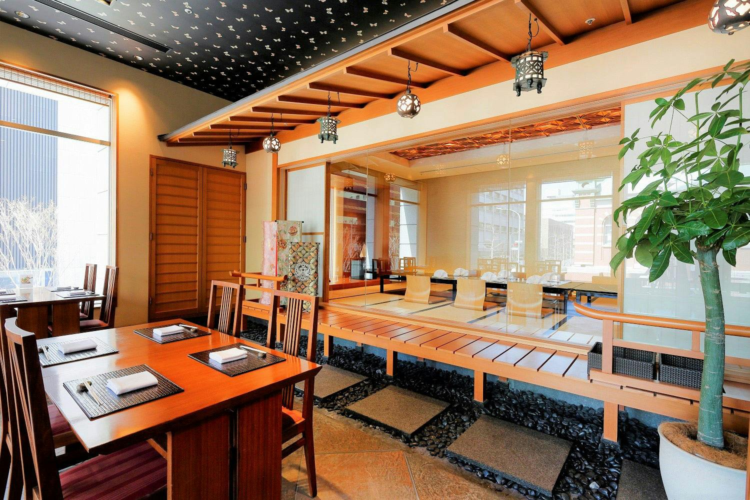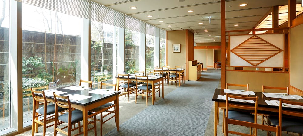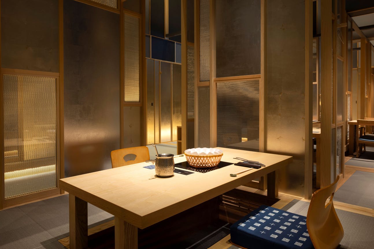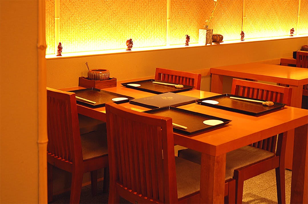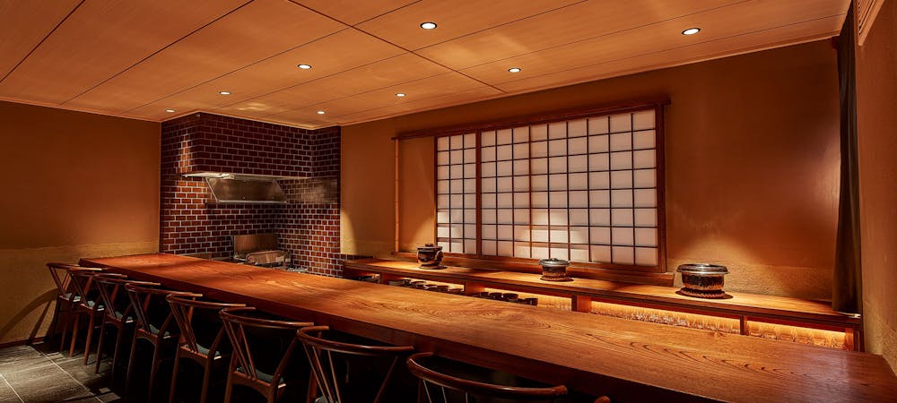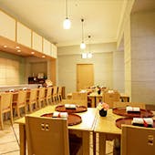 のれんをくぐり階段を下りると広がる、木材や石材など自然の素材と現代的なしつらえを融合させた落ち着いた空間。書道家が心を込めて描いた書のアートワークや盆栽のオブジェ、坪や暖簾などをあしらい、独特の世界観をお楽しみいただけます。半個室もご用意し、ダイニング内のカウンターには日本全国のお酒を味わえる角内も。ホテルダイニングならではのクラス感あるおもてなしで、外の喧騒を忘れるひと時をご提供いたします。