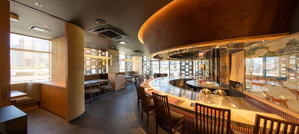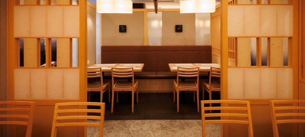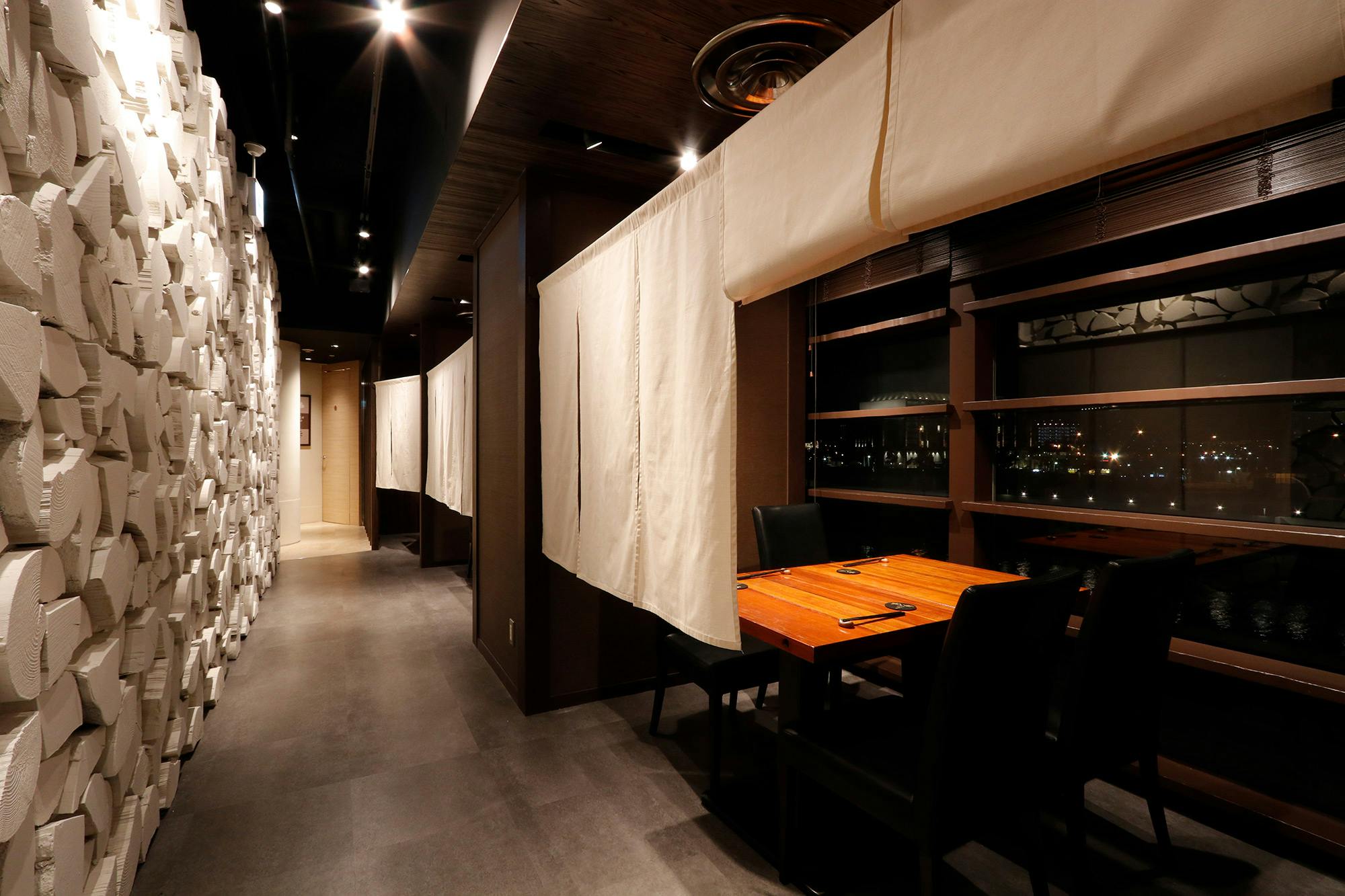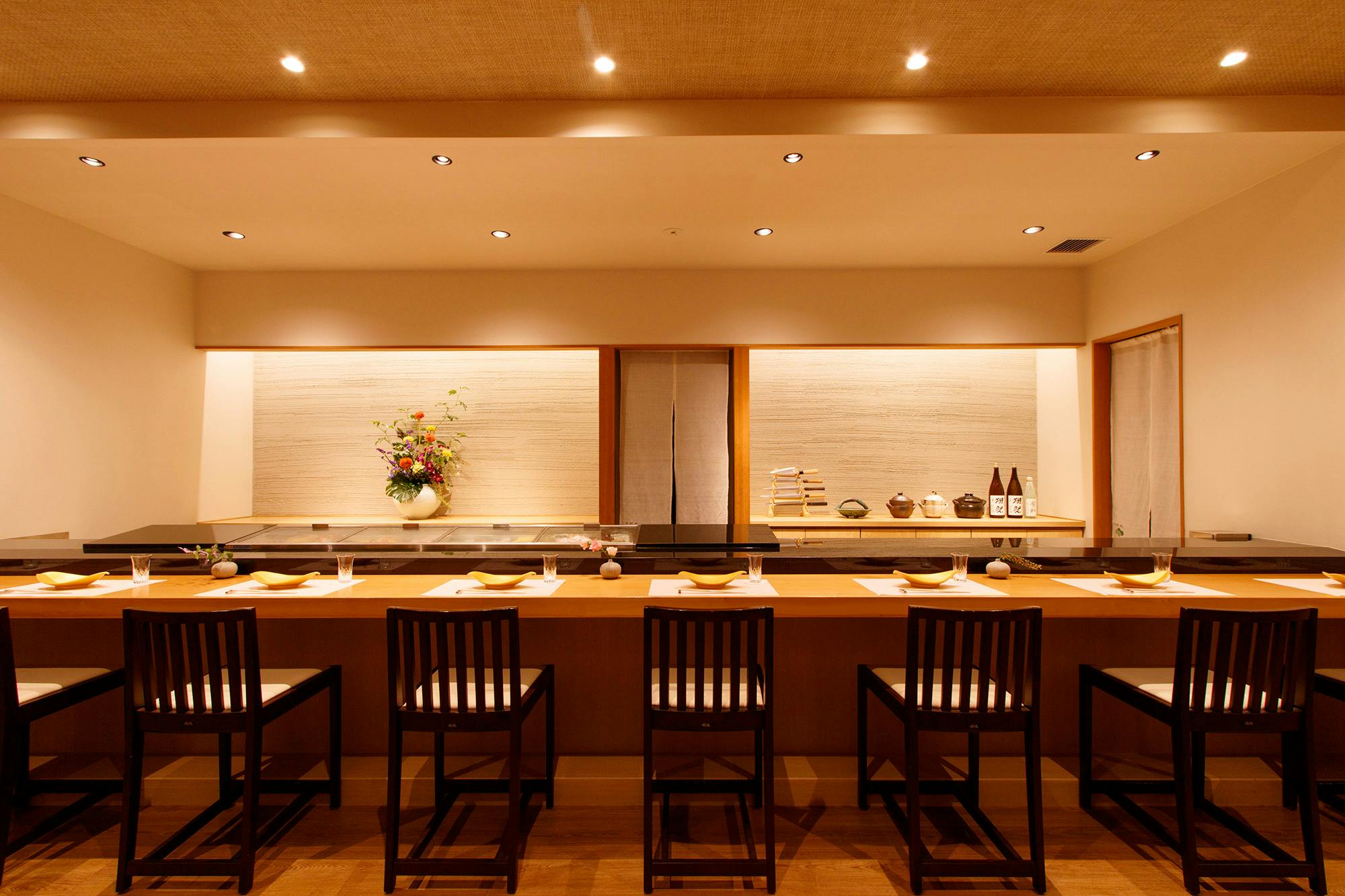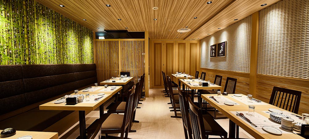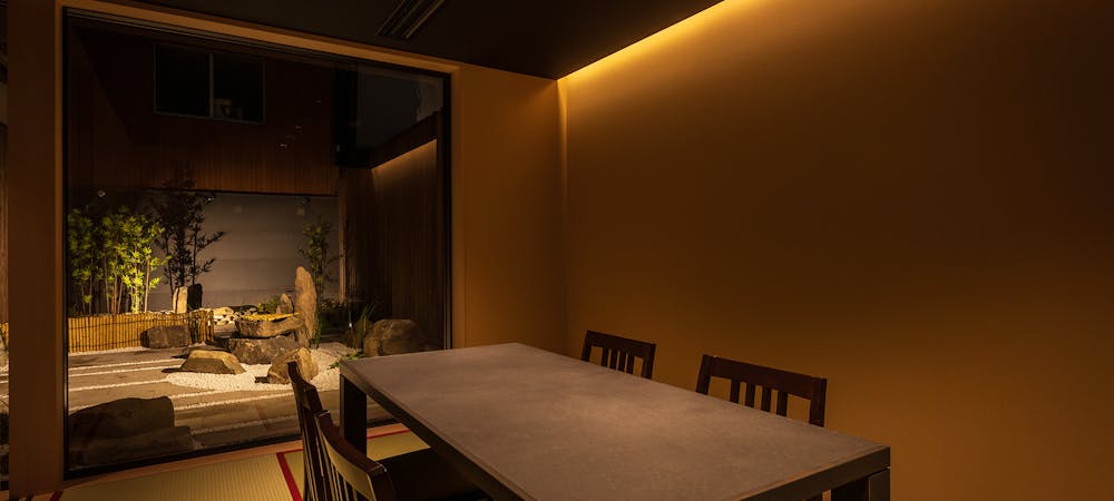 のれんをくぐり階段を下りると広がる、木材や石材など自然の素材と現代的なしつらえを融合させた落ち着いた空間。書道家が心を込めて描いた書のアートワークや盆栽のオブジェ、坪や暖簾などをあしらい、独特の世界観をお楽しみいただけます。半個室もご用意し、ダイニング内のカウンターには日本全国のお酒を味わえる角内も。ホテルダイニングならではのクラス感あるおもてなしで、外の喧騒を忘れるひと時をご提供いたします。