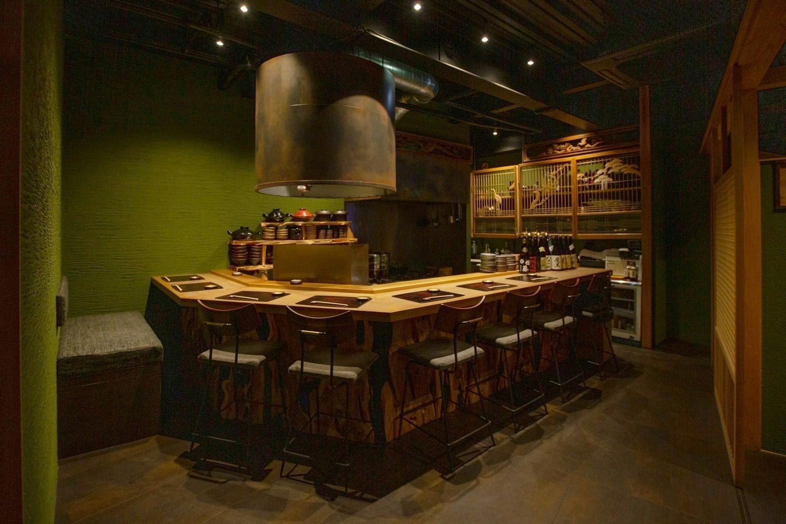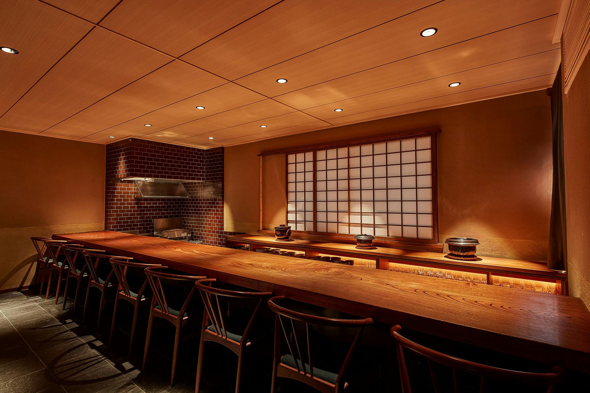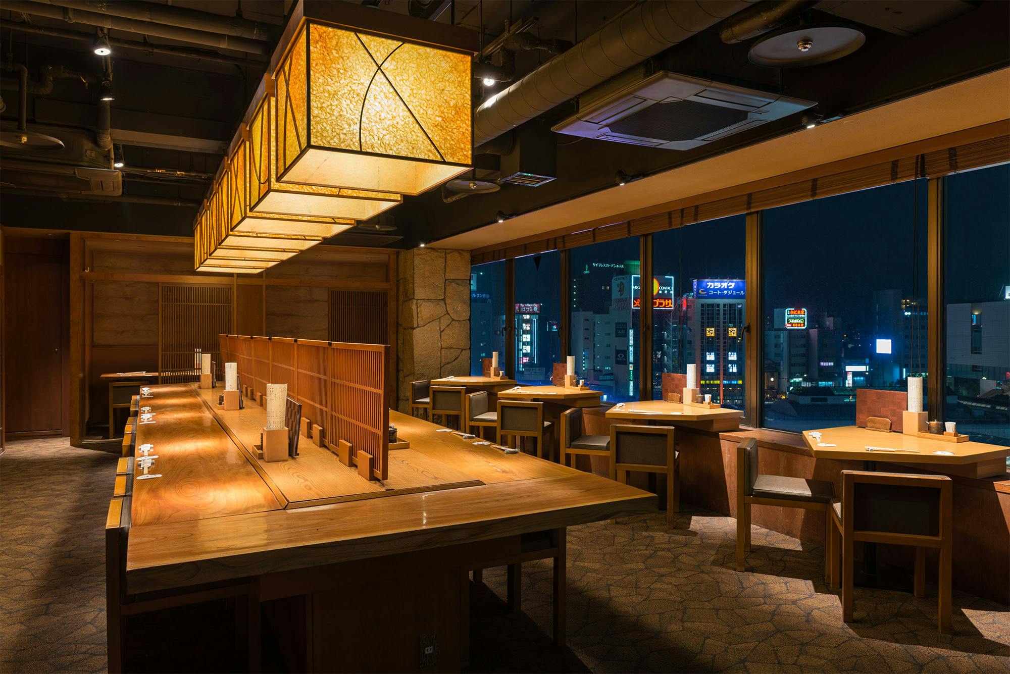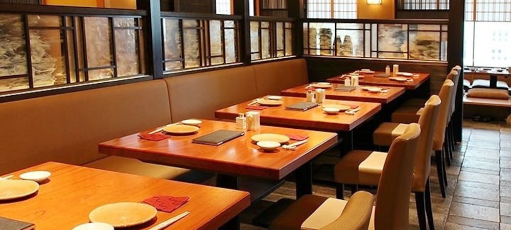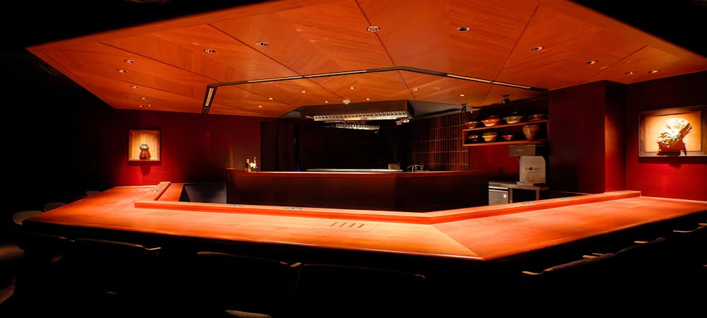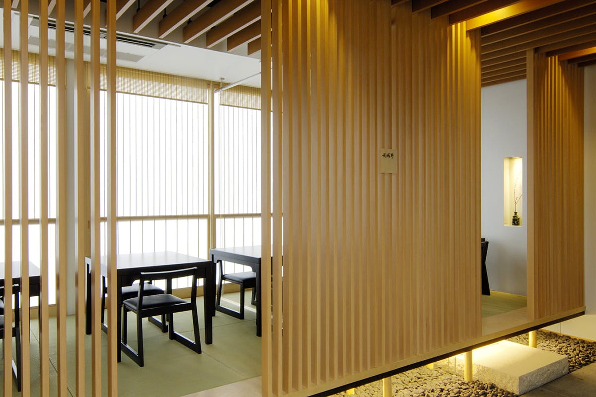 のれんをくぐり階段を下りると広がる、木材や石材など自然の素材と現代的なしつらえを融合させた落ち着いた空間。書道家が心を込めて描いた書のアートワークや盆栽のオブジェ、坪や暖簾などをあしらい、独特の世界観をお楽しみいただけます。半個室もご用意し、ダイニング内のカウンターには日本全国のお酒を味わえる角内も。ホテルダイニングならではのクラス感あるおもてなしで、外の喧騒を忘れるひと時をご提供いたします。