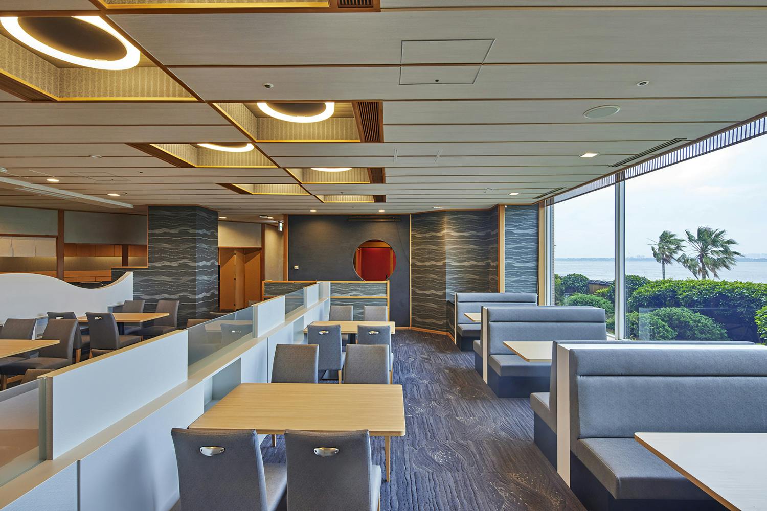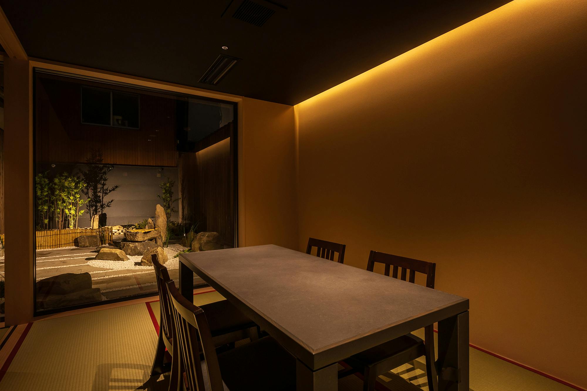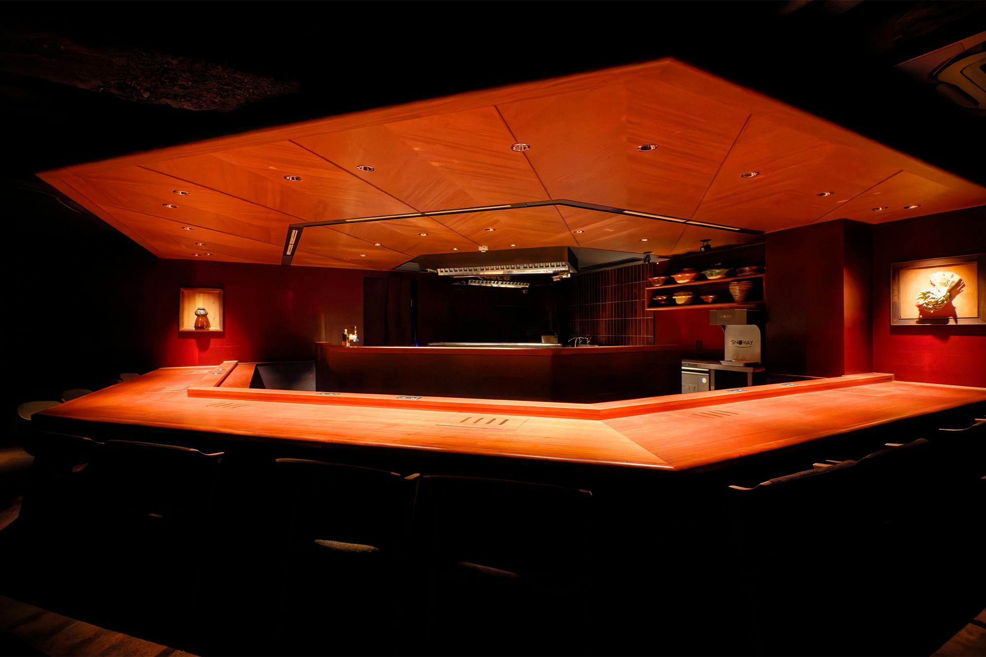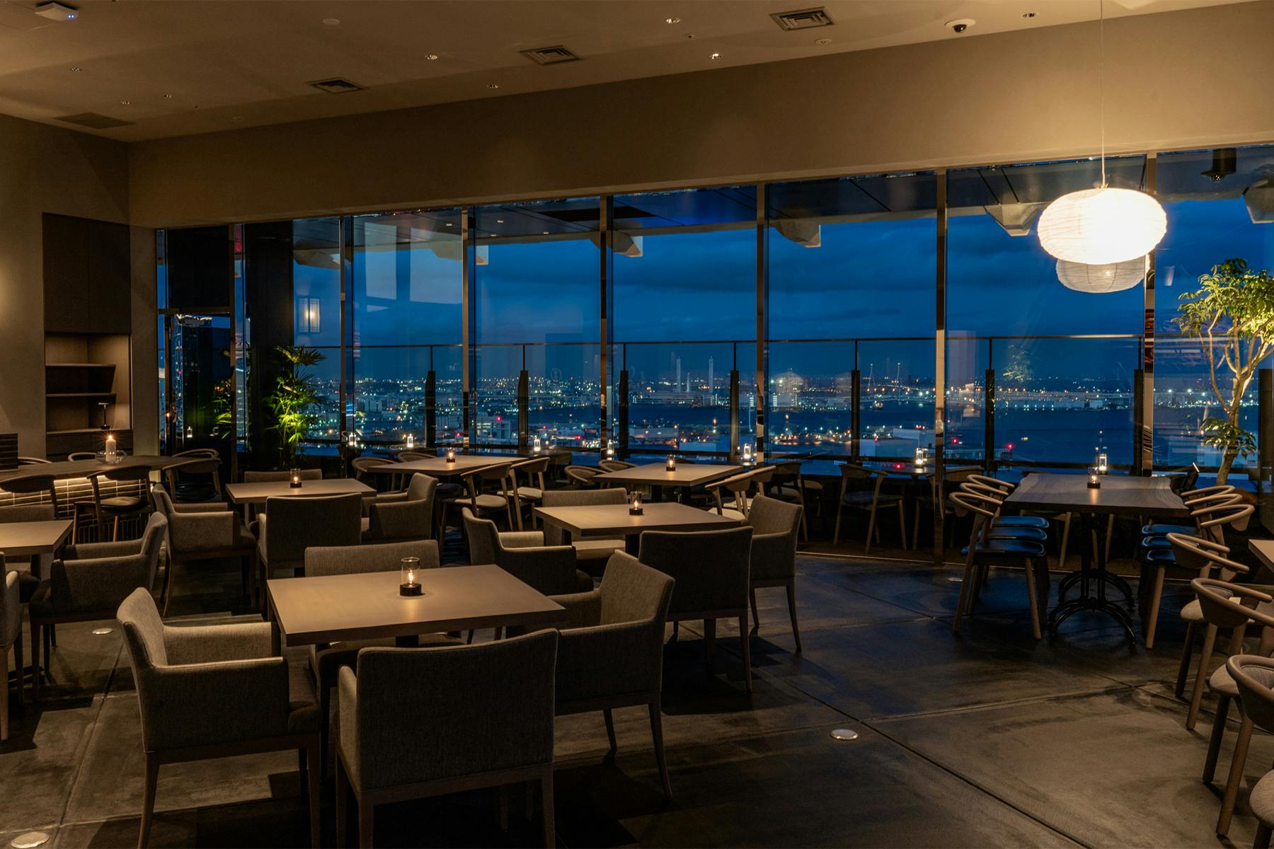 のれんをくぐり階段を下りると広がる、木材や石材など自然の素材と現代的なしつらえを融合させた落ち着いた空間。書道家が心を込めて描いた書のアートワークや盆栽のオブジェ、坪や暖簾などをあしらい、独特の世界観をお楽しみいただけます。半個室もご用意し、ダイニング内のカウンターには日本全国のお酒を味わえる角内も。ホテルダイニングならではのクラス感あるおもてなしで、外の喧騒を忘れるひと時をご提供いたします。
