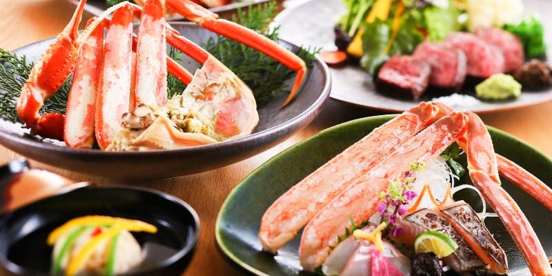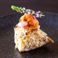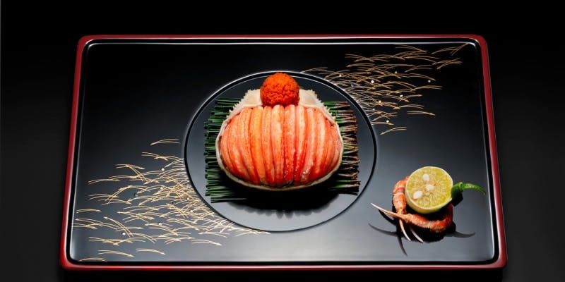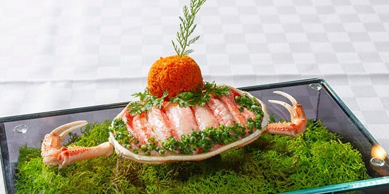 地元漁港より直送されるタグ付き活松葉蟹一匹を贅沢に使用した冬季限定のランチコースとなっております。 椀、お造り、茹で、炭火焼きと様々な調理法で活松葉蟹の凝縮された旨味と風味を引き出します。 地元食材をふんだんに使用した献立となっておりますので、ランチタイムに肩ひじ張らずに冬の但馬をご堪能くださいませ。 ランチ 38,500円