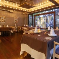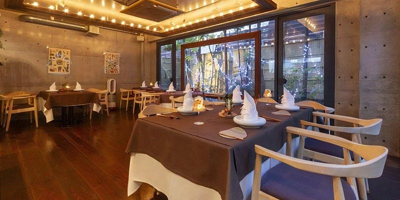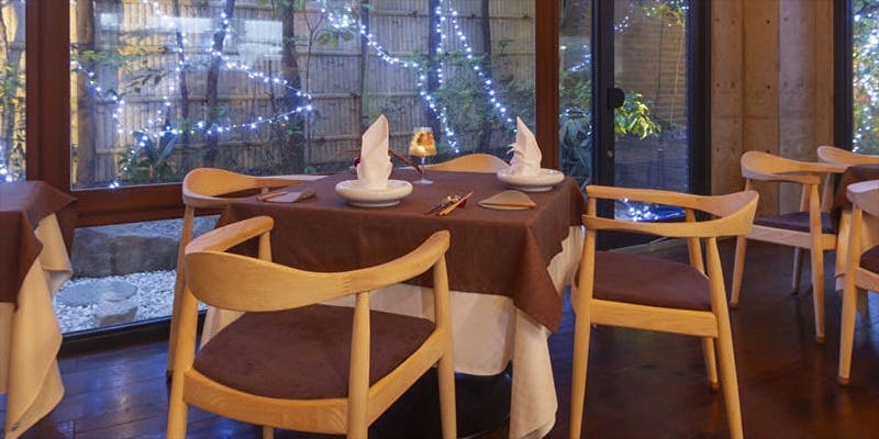 店内にある大きな窓越しに、お昼は中庭の緑を眺めながら自然光に包まれる暖かい雰囲気、夜はライトアップされた中庭を眺めながらロマンチックな雰囲気でお愉しみいただけます。普段の気軽なデートはもちろん、特別な記念日など大切な日にも最適です。ぜひ当店で至福のひとときをお過ごしくださいませ。