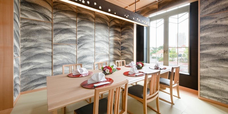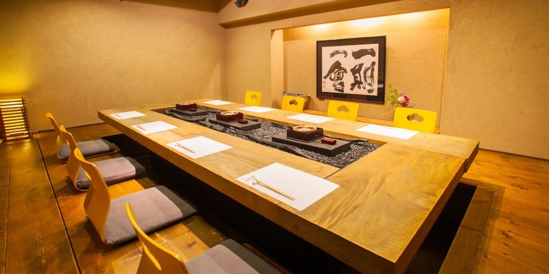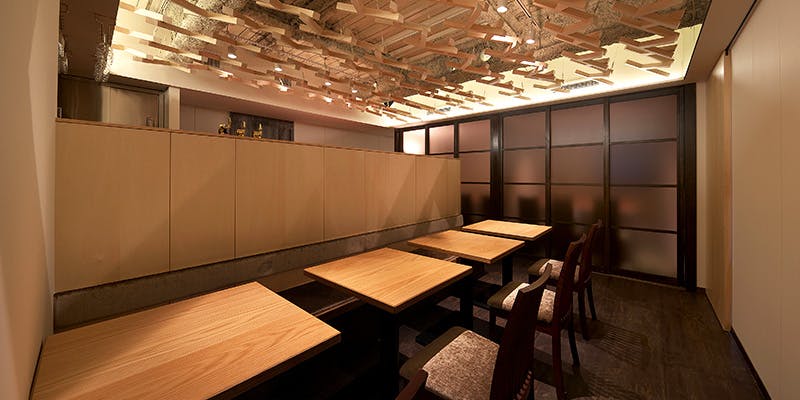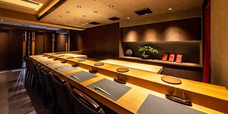 凛とした空気の満ちる店内で、潔く洗練されたカウンターと個室席をご用意しております。会食、接待などのオフィシャル利用、海外ゲストを招いての会にも最適な空間です。
