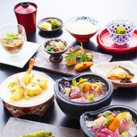 各種宴会に一番人気。お店名物の鯛めしを、お造りや天ぷらといった逸品とともにご堪能いただけるコースです。電気炊飯器では味わえない、南部鉄器の鉄鍋で炊き上げる鯛めし。直火ならではの香ばしいおこげがたまりません。お出汁を注いで鯛茶漬けにするのもまた格別です。 ディナー 4,500円