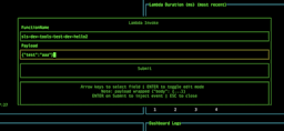 右上のLambdaのリストから実行したいLambdaファンクションを選択してiを押すと以下のようにPayloadを入力するwindowが立ち上がります。そこから入力となるJSONを入力してSubmitでenterを押すことで対象のLambdaファンクションが実行されます