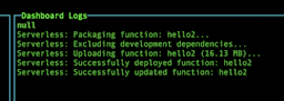d ショートカットを押すことで選択したLambdaファンクション単体がデプロイされます。hello2ファンクションを選択して d を実行すると以下のようにデプロイされます。