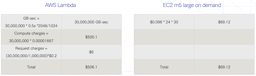 月間3千万リクエスト、1リクエスト辺りのプログラムの平均実行時間が0.5秒、必要なメモリサイズは2048MBのワークロードを考えてみましょう。m5.largeインスタンスでこのトラフィックをさばけたと仮定して、以下のようになります。