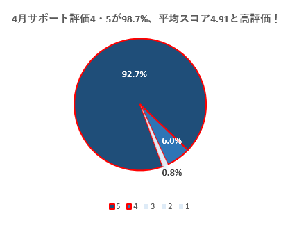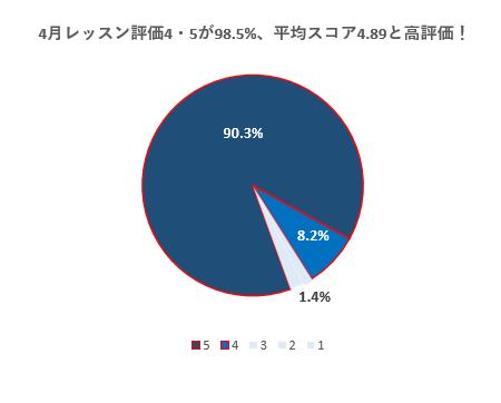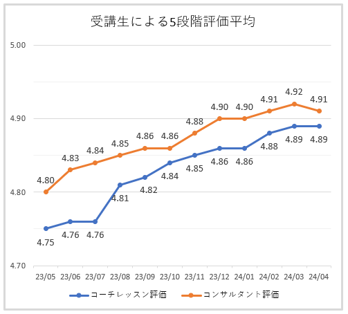 2024年4月の平均スコアは、ネイティブコーチのレッスン評価が4.89(前月3月は4.89)、コンサルタントのサポート評価が4.91(前月3月は4.92)と、引き続き受講生からの高い評価をいただいています。