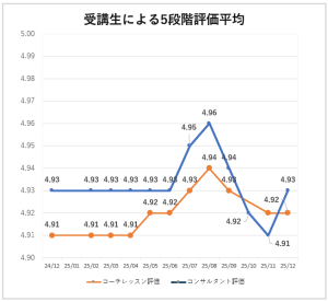 2025年12月の平均スコアは、ネイティブコーチのレッスン評価が4.92(前月11月は4.92)と、コンサルタントのサポート評価が4.93(前月11月は4.91)と、引き続き受講生からの高い評価をいただいています。
