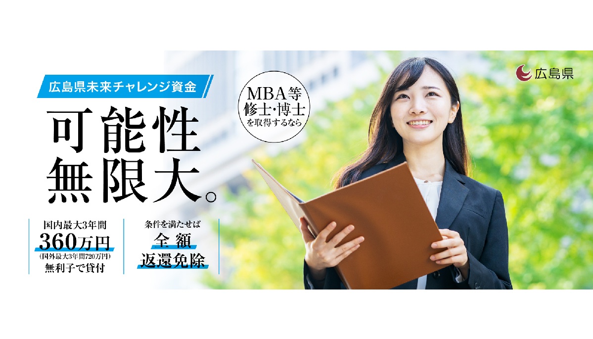 広島県 社会人大学院生向け貸付金「広島県未来チャレンジ基金」2025年度第4次募集開始 返還免除規定も