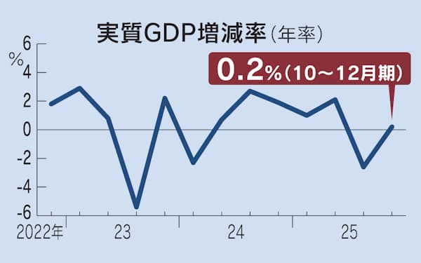 25年10〜12月実質GDP、年率0.2%増2四半期ぶりプラスも輸出は減