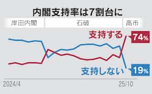 日本経済新聞社とテレビ東京は24〜26日に世論調査を実施した。21日に発足した高市早苗内閣の支持率は74%で、前の石破茂内閣が発足した際の51%よりも20ポイント以上高かった。石破内閣最後の9月の前回調査からは37ポイント上昇した。高市内閣を「支持しない」は19%にとどまった。 現行の調査方式になった2002年以降に発足した内閣と比較すると、高市内閣は鳩山由紀夫内閣(75%)、菅義偉内閣(74%…