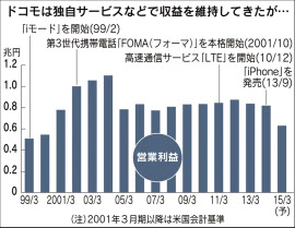iPhone(アイフォーン)をもってしても巨人の進撃はならなかった。NTTドコモは31日、2015年3月期の連結営業利益が前期比23%減の6300億円にとどまる見通しだと発表した。過去15年間で最も低く、初めて携帯電話大手3社でも最低となる。直接の原因は6月に導入した新料金プランの誤算だが、背景には環境変化に機敏に対応できない「電電公社」体質がある。