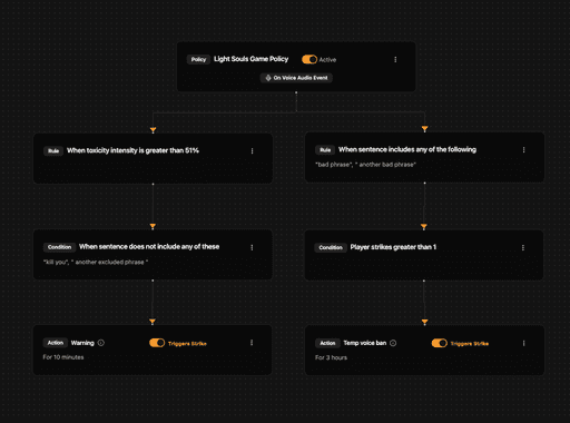 Visually define your community's rules & policies. Automatically players within seconds of them being toxic.