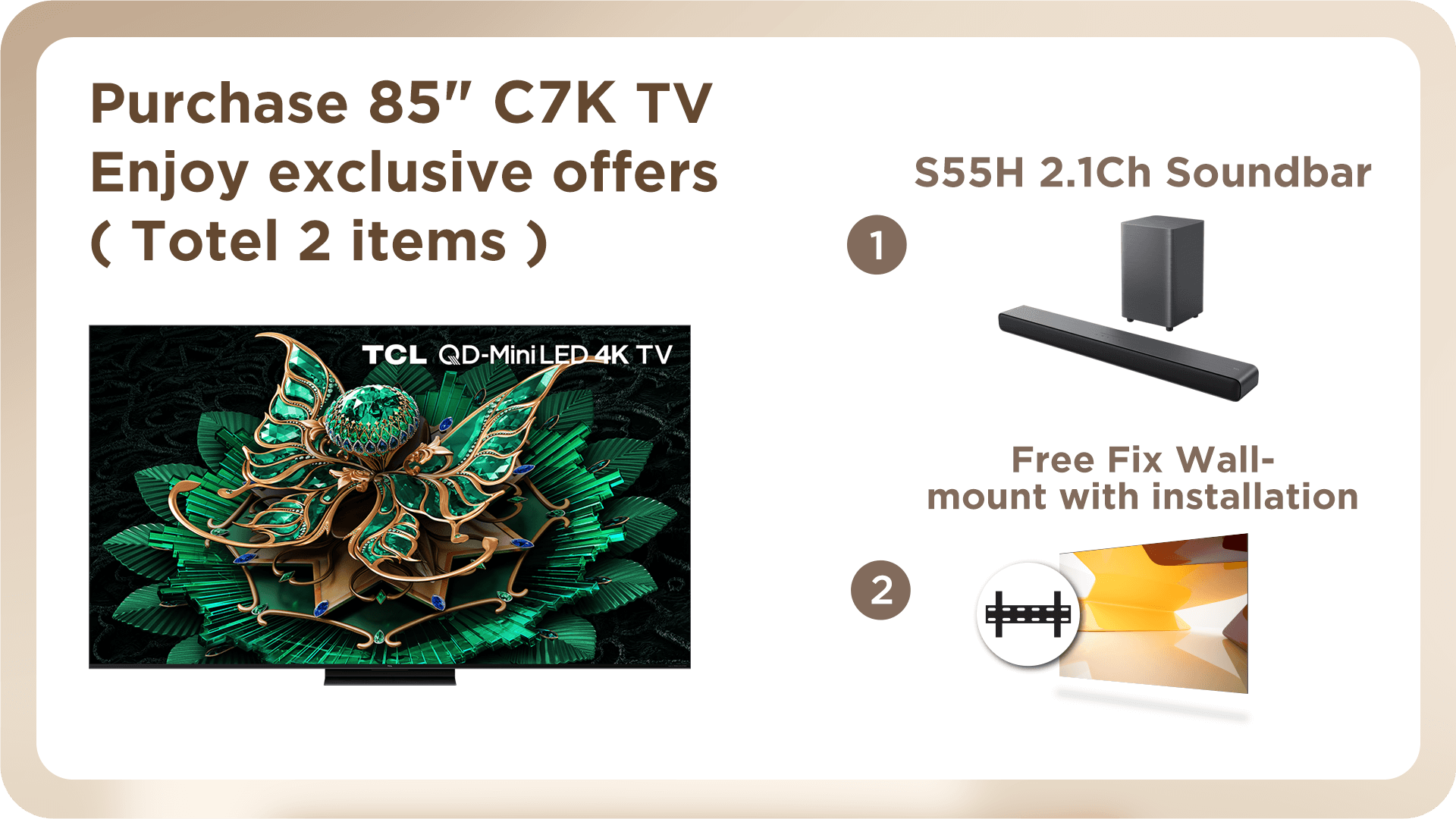 c) Purchase 98C8K / 85C8K / 75C8K / 65C8K / 85C7K / 75C7K / 65C7K / 55C7K TV, offer TCL S55H Soundbar and Fixed Wall-mount with installation service.