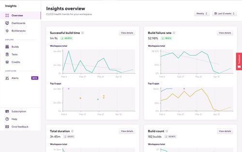Steer clear of unwelcome surprises when building your mobile app. Get the data you need, when you need it, to pinpoint flaky tests and breaking builds earlier. Our CI/CD monitoring dashboard provides actionable insights, including build, test, build cache, and credit data. This empowers you to enhance efficiency by illuminating the root of your challenges, effectively unblocking your development pathway.