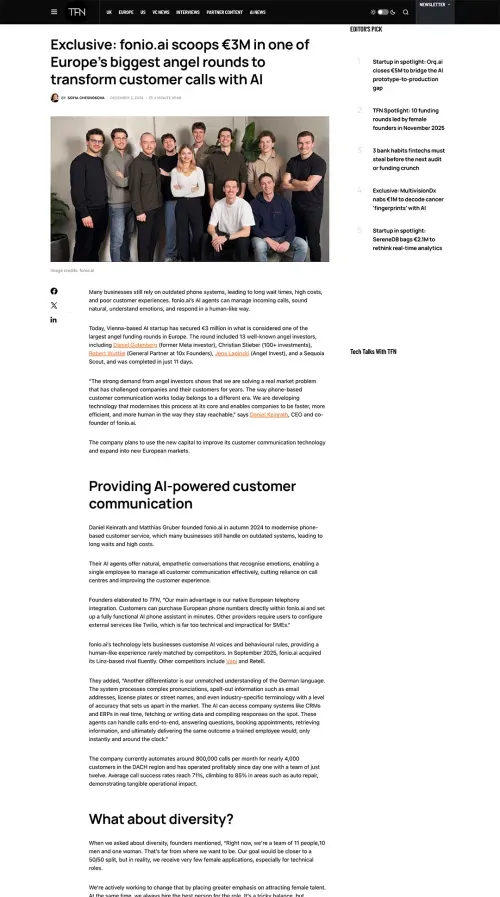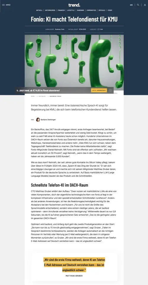 fonio.ai unterstützt sowohl eingehende als auch ausgehende Anrufe und bietet dafür eigene Telefonnummern, die direkt über die Plattform erhältlich sind. Seit dem Start im September 2024 hat die Plattform bereits über tausende Kunden gewonnen und ist Marktführer im DACH-Raum.
