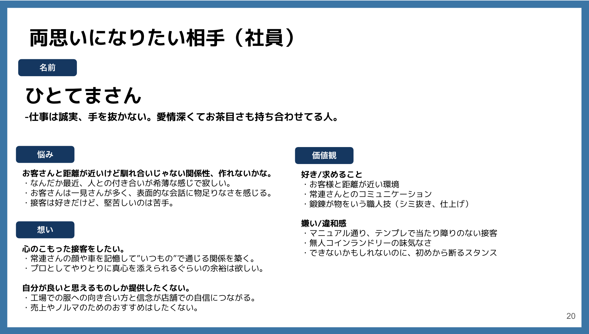 その後新卒10年目の工場長、70代現役の店舗スタッフ等7名のメンバーと6回のワークショップを行い会社の魅力を深堀りしました。店舗業務体験や工場見学もさせていただき魅力を抽出。機械導入・無人化が進む業界で当たり前に重ねてきた、人の手間がかかる選択…そんな”人手間”を大事にしているのが日東サービスさんであり、その在り方が接客を超えた”ご近所づきあい”を育んでいるということが、常連さんへの取材からも伺えました。