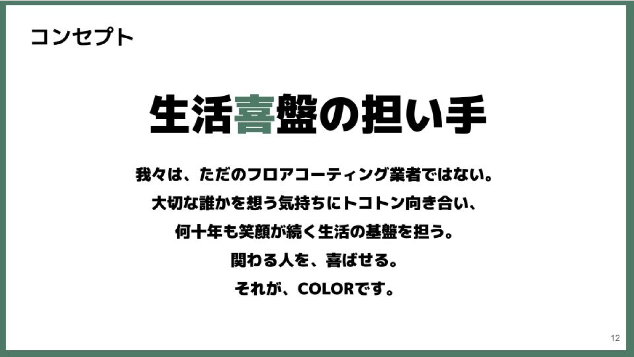 まずは西村社長の経歴や想いを取材。「お客様にも社員にも喜んでほしい」と思っているものの、それがどういうことなのかカタチにしていく必要がありました。PJメンバーとも全員の脳みそが煮えたぎるまでワークを重ね、同業界で確立したいCOLORらしさを抽出。その後全ての取材やワークの記録を見返し、西村社長から紡がれた言葉を拾う中で紐づいた想いの芯…。