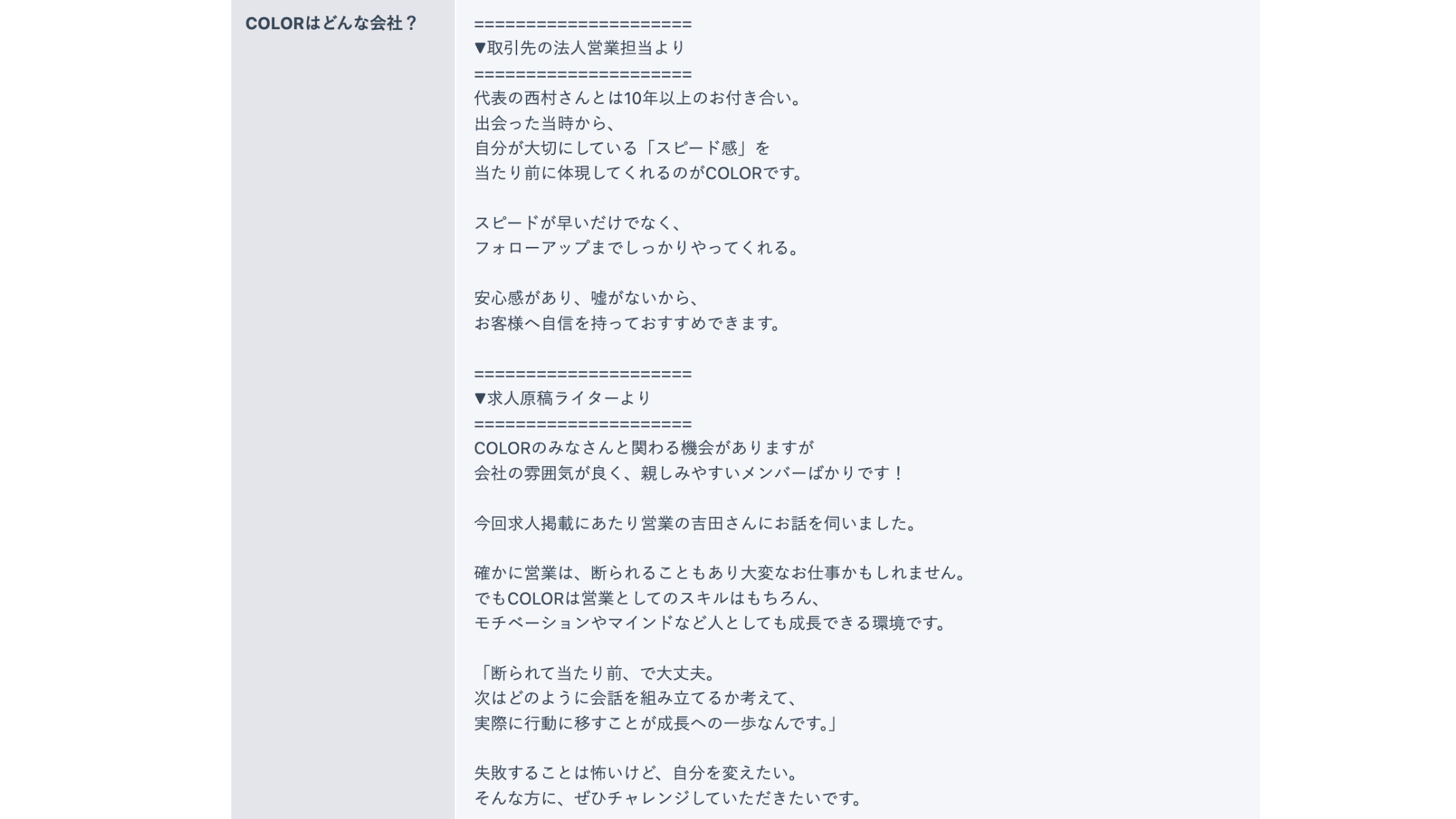 さらにCOLORと長年のお付き合いがある取引先(常連さん)やインビジョン側の目線で、会社の印象を言語化。当事者以外からのイメージを記入することで、よりリアルな社風を盛り込んでいます。