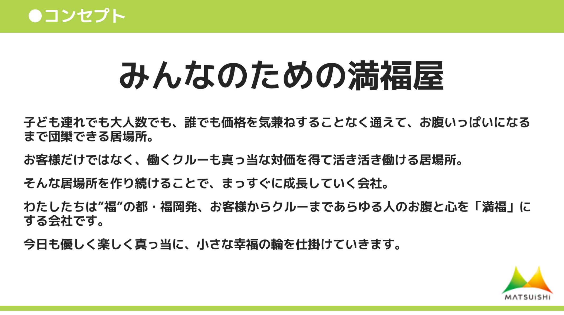 そんな会社を、お店を確立させていくという想いを言語化したブランドコンセプトは「みんなのための満福屋」。