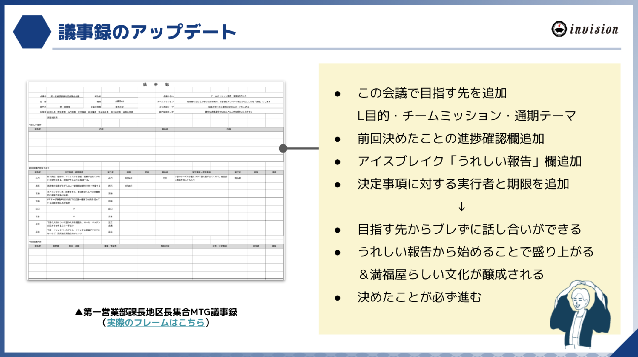 会議の質を向上すべく、目的や進行の仕方・ルールを再定義→仕組み(議事録フレーム)に落とし込み