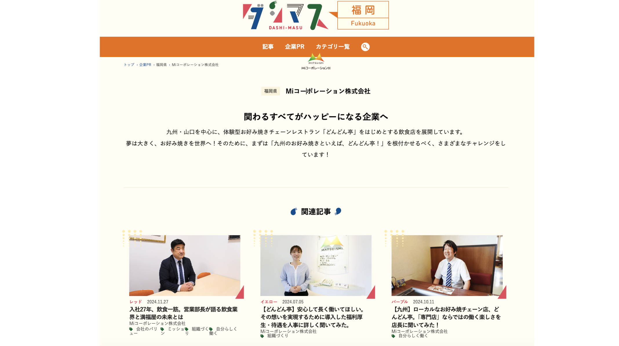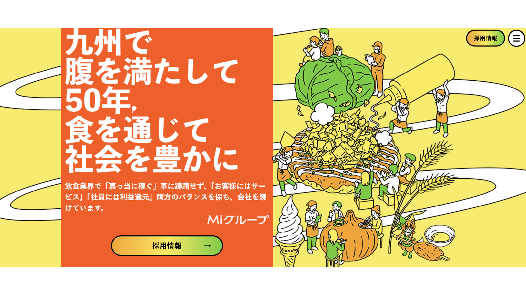 九州を中心にお好み焼きチェーン「どんどん亭」やフードコート業態を展開するMiコーポレーション株式会社。「人々の食生活を豊かにしたい」という先々代の想いを受け継ぎながら、先日設立55周年を迎えました(2025年3月時点)。現在、企業コンセプト「みんなのための満福屋」として、どんどん亭をはじめ全国50店舗以上を出店しています。