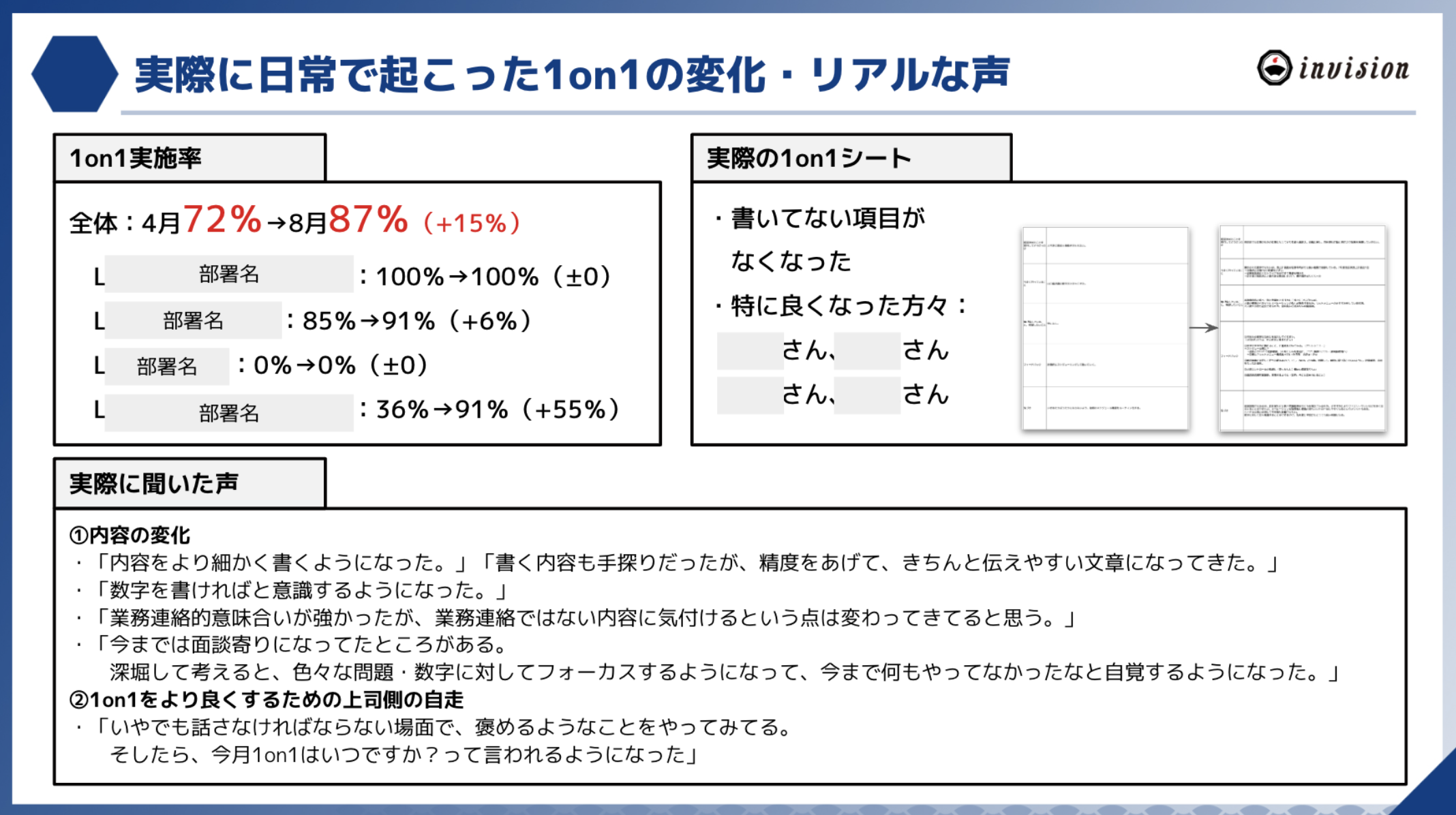 各ミドルマネージャーと定期的にうまくいっていること・つまづいていることを本音で話し合いながら下記の施策を行ってきました。