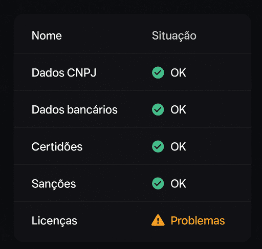 O fornecedor recebe o convite e realiza o cadastro em poucos minutos, com validação automática de dados fiscais e bancários, emissão de certidões e consulta de base públicas.