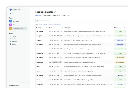 Feedback Explorer in the Mapbox Developer Console lets you sort, filter, and review reports with Quick Filters. Each report includes type, location, and screenshots. Define custom categories* tailored to your business to tag issues like delivery access, app bugs, or POI details, all organized in Feedback Explorer, ready for your service teams.