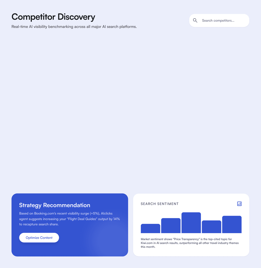Real-time prompt monitoring, visibility scoring, and industry benchmarking.