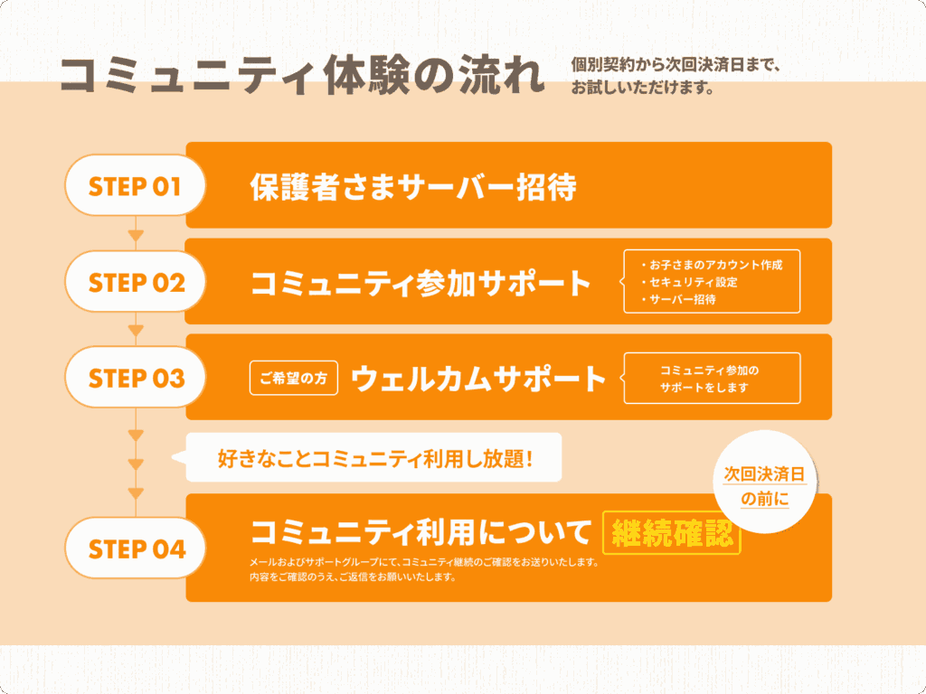 厳選採用されたスタッフによる伴走のもと、1対1の完全カスタマイズプログラムを提供。万が一トラブルがあった際も、本人とスタッフだけの安全な対話チャンネルで対応します。