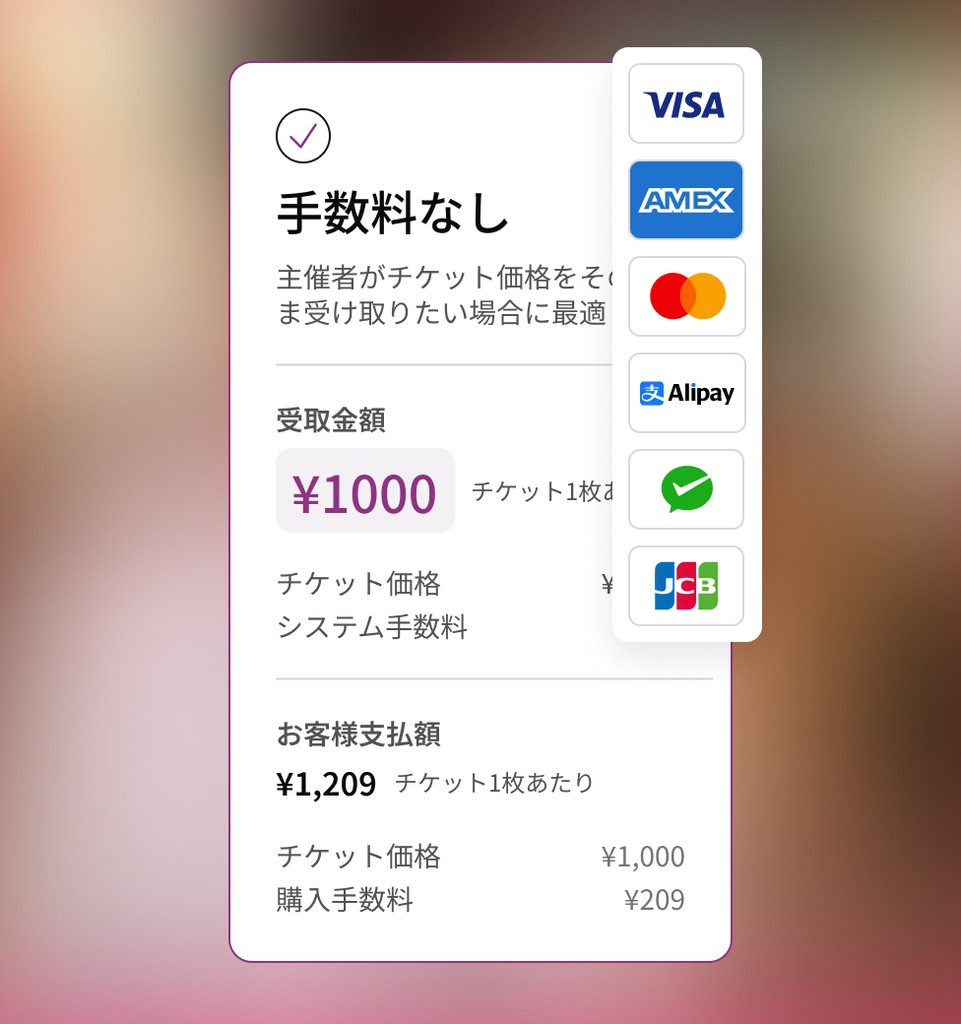 ZAIKOは、手数料の扱いについて完全な柔軟性を提供します。プラットフォーム手数料を主催者が負担するか、参加者と共有するか、あるいは全額を参加者に転嫁するかを選択できます。イベントを公開する前に明確な支払いプレビューを取得できるため、常に収益を把握できます。また、コンビニ決済や国際決済も受け入れることができ、より少ない障壁でより多くのファンにリーチしたい主催者にとって信頼できるオプションです。
