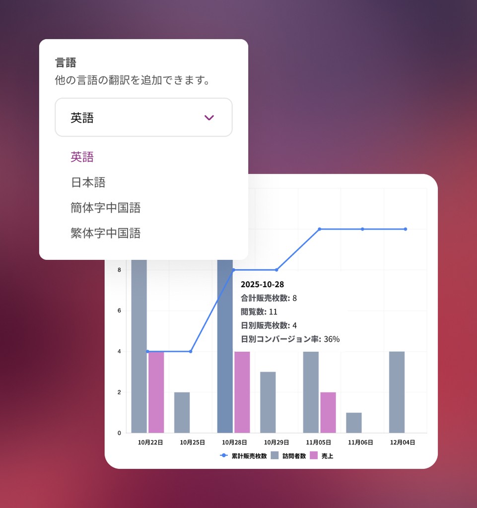 最初から国際的なイベント向けに構築されたツールで、世界中のファンにリーチできます。多言語ページを作成し、主要なグローバル決済方法に対応し、地域に応じて自動的に適応する価格設定と税金を提供します。あなたのオーディエンスが地元であれ世界中であれ、あなたのイベントはグローバル化に対応しています。