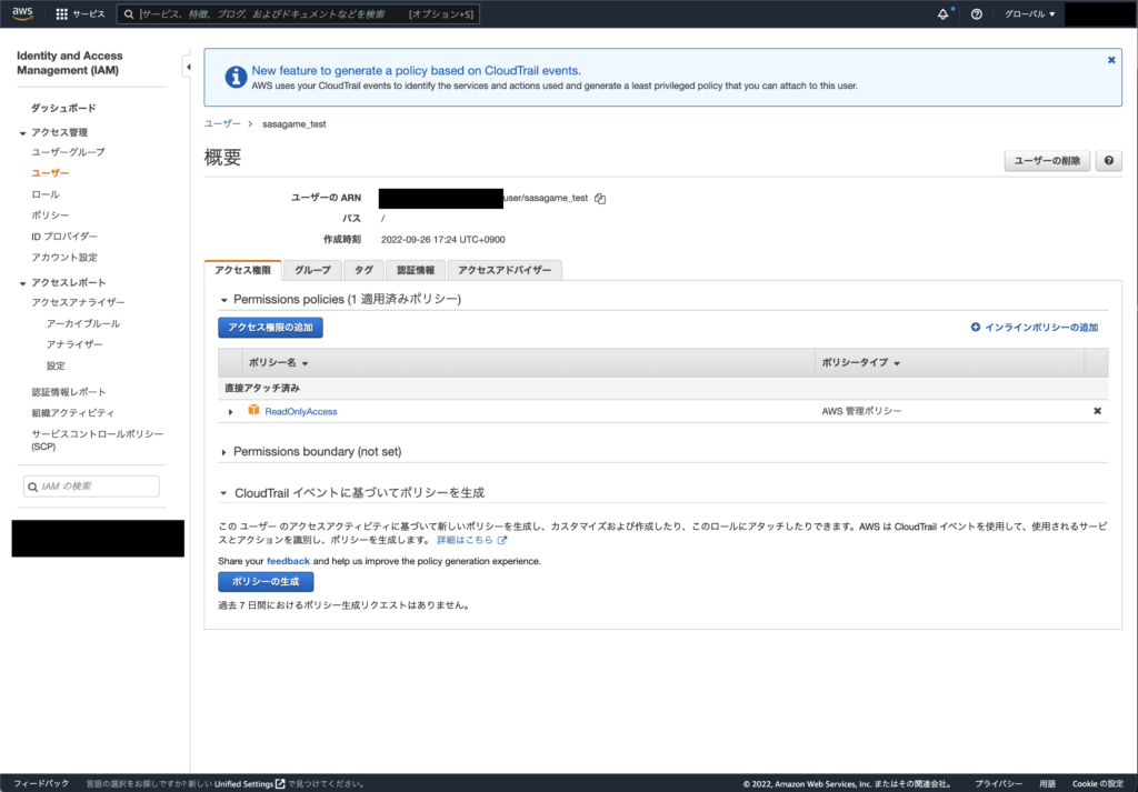 - スキャンをしたいAWSアカウントに全てのAWSリソースへの参照権限を付与したユーザを作成(※1)
