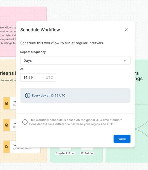 Spatial workflows are often siloed and manual, making automation and integration a challenge. Use Workflows to automate, schedule & trigger analysis - seamlessly embedding processes into your broader infrastructure.
