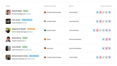 Stay compliant across borders with HRIS and payroll solutions tailored to local labor laws, leave policies, and regulations, ensuring seamless compliance across your offices and entities.